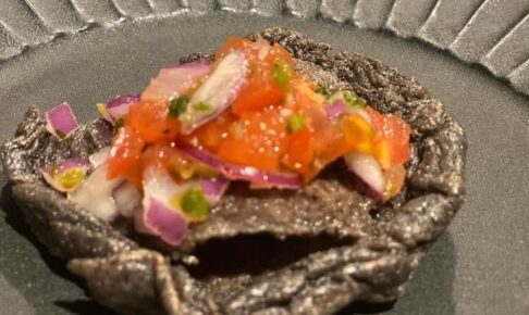 まだ試作途中ソペスはトルティーヤを揚げ焼き外カリ・中もちの小さなつまみ。鶏むね+豆+トマトで軽く。ちょっと手間もの。1人作業なので少量です。