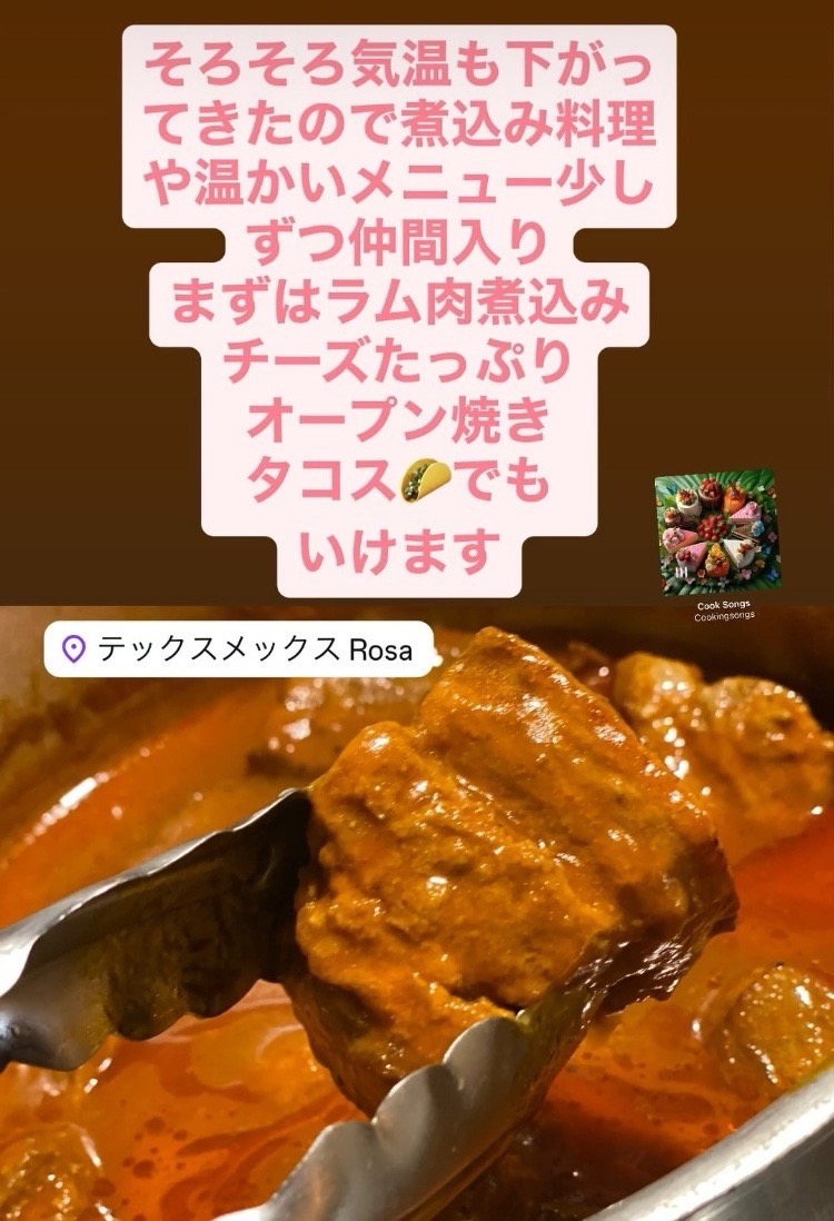 温かいメニュー 2025年9月18日 未分類 ツイート シェア はてブ 送る Pocket そろそろ気温も下がってきたので煮込み料理や温かいメニュー少しずつ仲間入り まずはラム肉煮込みチーズたっぷりオーブン焼きタコスでもいけます!