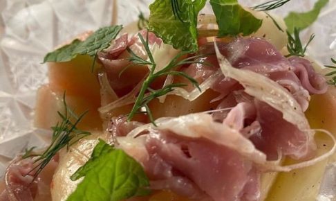 夏の人気前菜 桃🍑と生ハムのサラダ 桃の甘み、生ハムの旨みに茗荷ミント、ディルが香るさっぱりとした前菜です👍 タコス🌮の前に是非どうぞ!