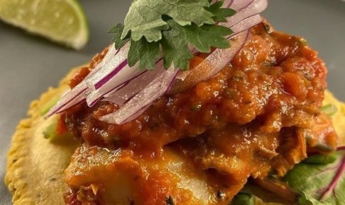 タコスの自由度を生かし個人的にも好きな、南イタリア料理サルサ トラパネーゼを使った料理です。 定番ニンニク、トマト、バジルにアーモンドペーストが入ったサルサローザの手作りコーントルティーヤ🌽にも合います👍 是非ご賞味を😋